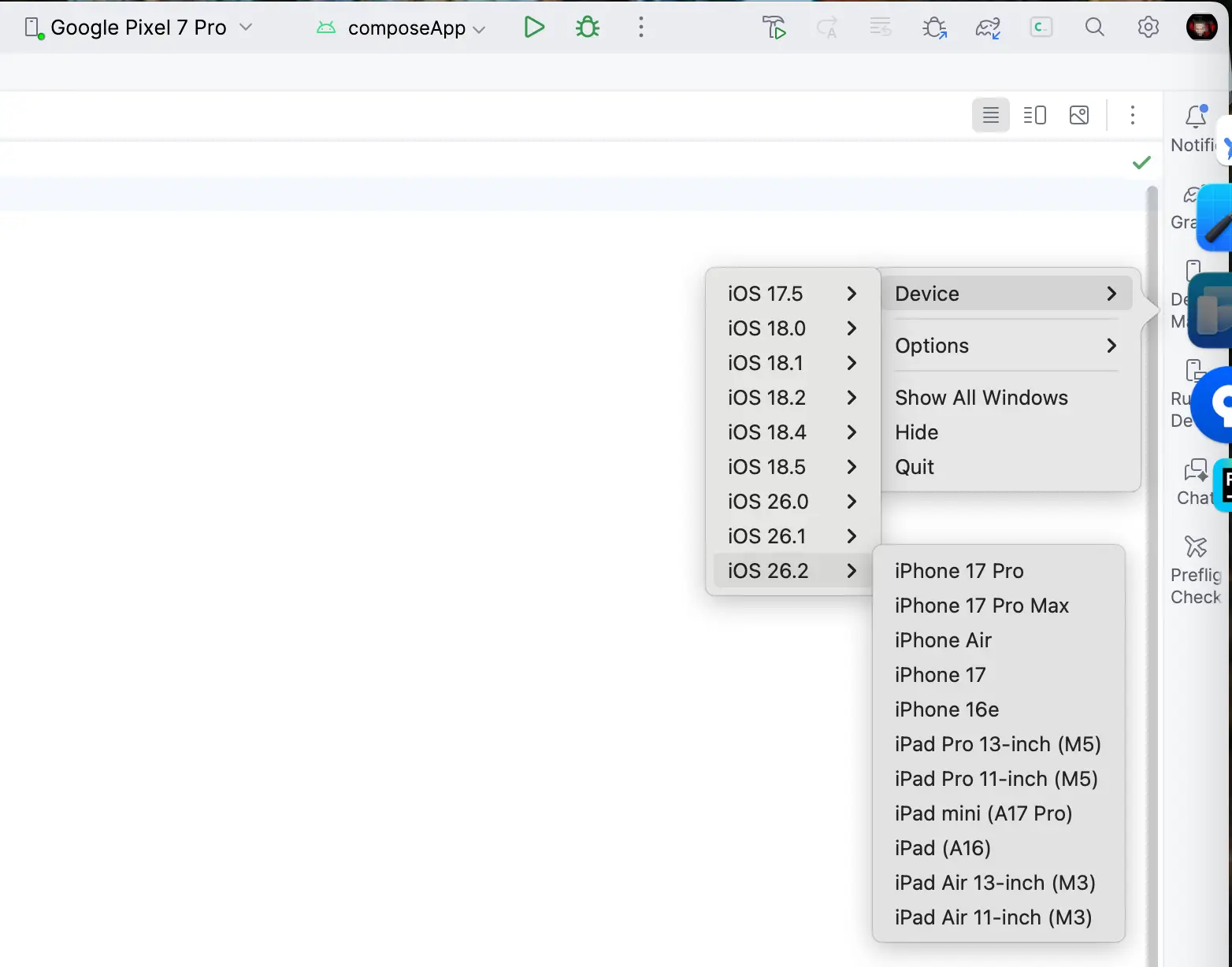 Android and Desktop should run out of the box, but iOS may need two small fixes depending on your Mac/Xcode setup:- In composeApp/build.gradle.kts, add iosX64() to the iOS targets list to support the iOS Simulator on Intel Macs.
